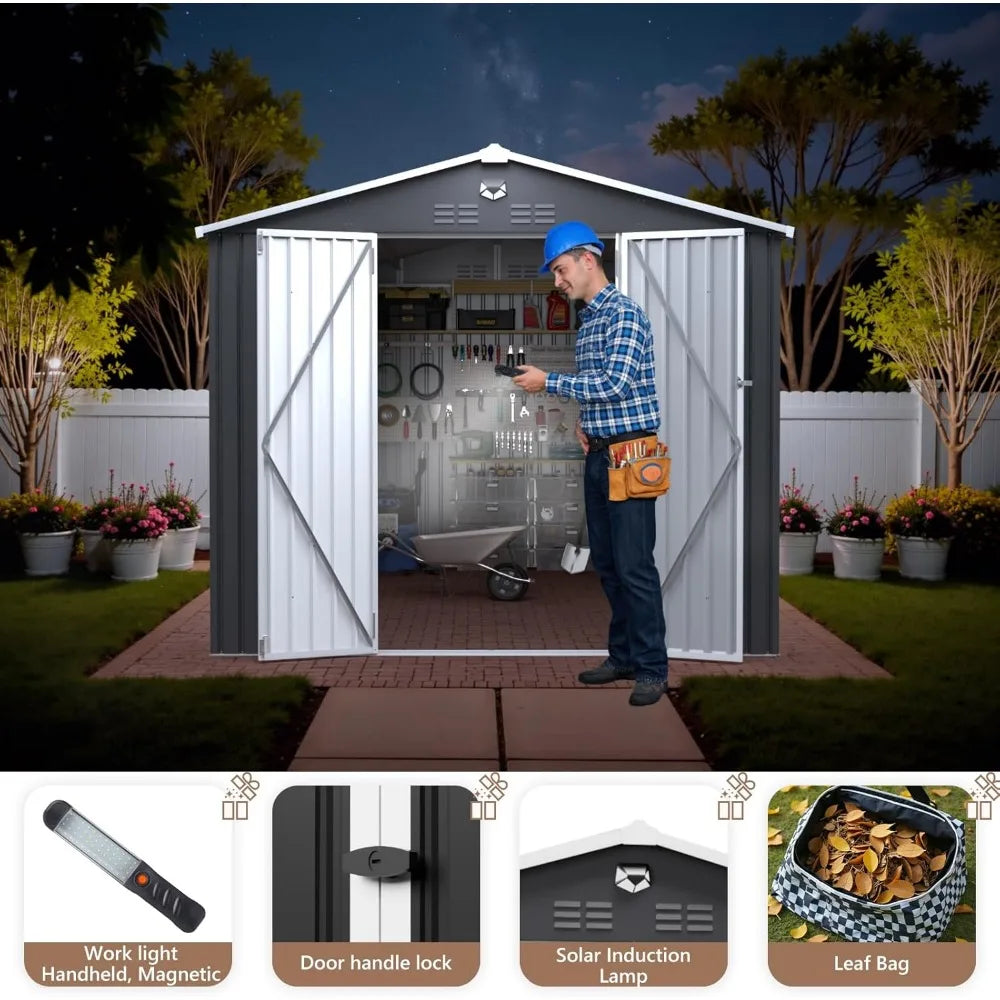 - 【Bonus Outdoor Accessories】:This garden shed kit includes thoughtful accessories to enhance your storage convenience: a practical handheld work light, an outdoor solar-powered sensor light for nighttime accessibility, a durable leaf bag for easy yard maintenance, and a secure door lock to protect your valuable items.