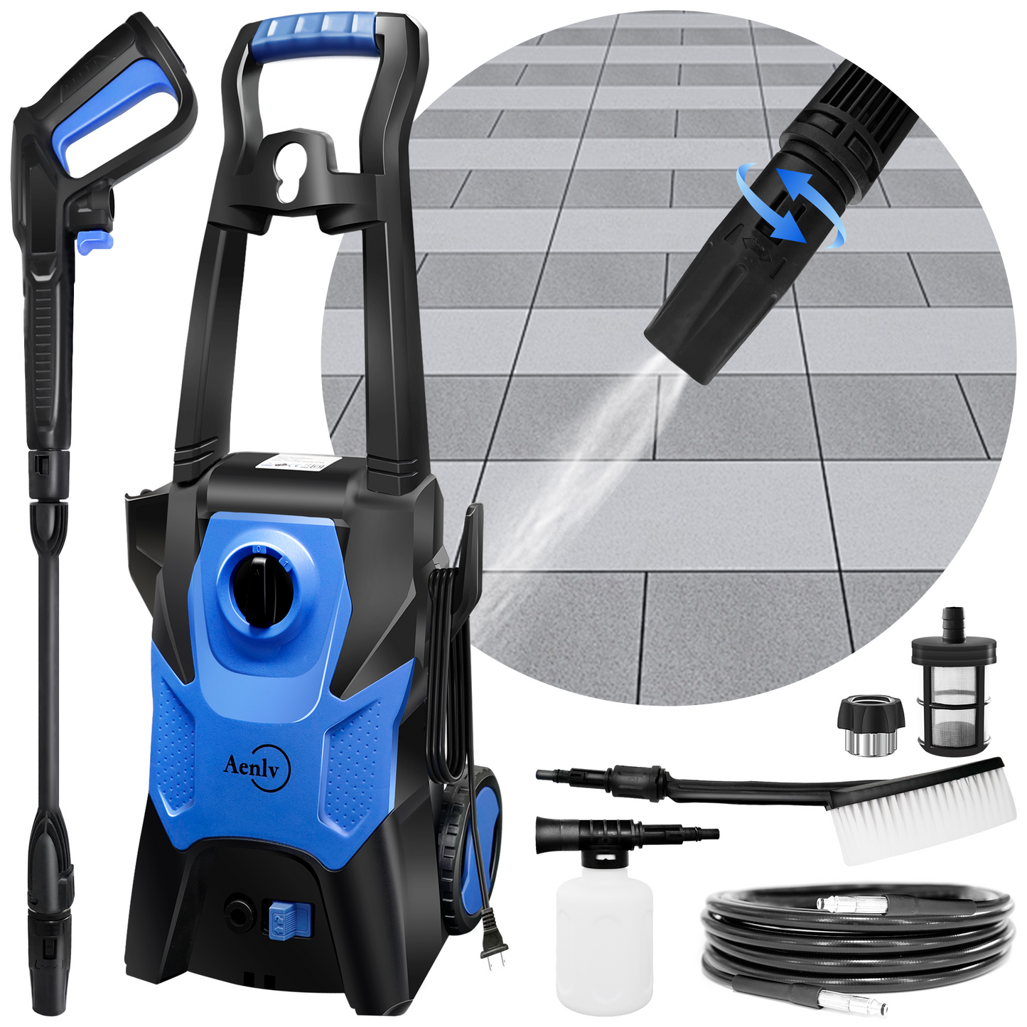 - 【Rotatable Nozzles】: Compared with others, Aenlv electric pressure washer need not to change nozzle, just turn the head of spray gun clockwise or counterclockwise to adjust the pressure. 0~45°for all your needs, tackle grime, rust, mud, & more cleaning task. The attached foam spray produces rich bubbles for washing your car.