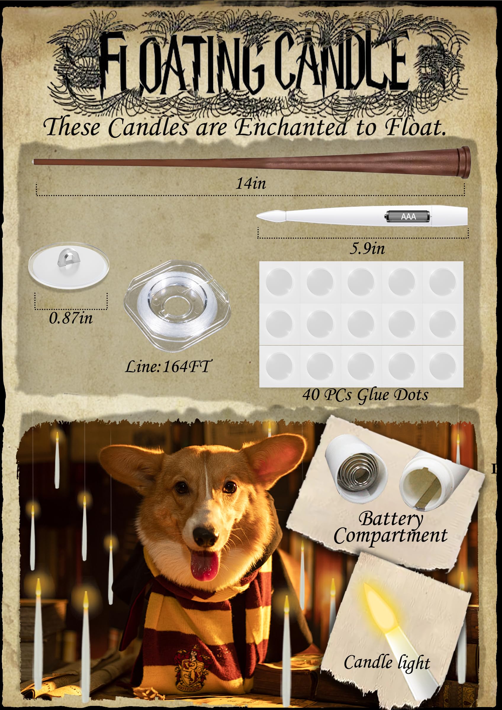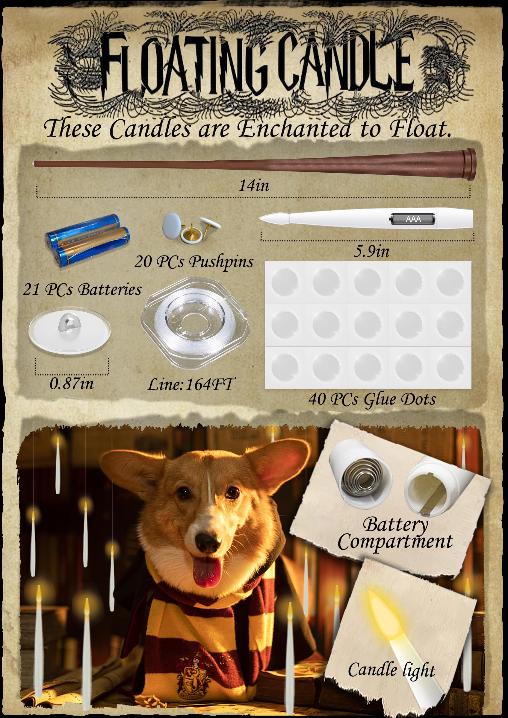 - CONVENIENT & EASY TO USE - The floating candles with wand 0.6"(D)×5.9"(H) came with 20 hooks and 160FT fishing line, hang them wherever you like using the equipped hook or Get creative and find your own unique way to display it. Or just place some of the candles on a shelf or table.
