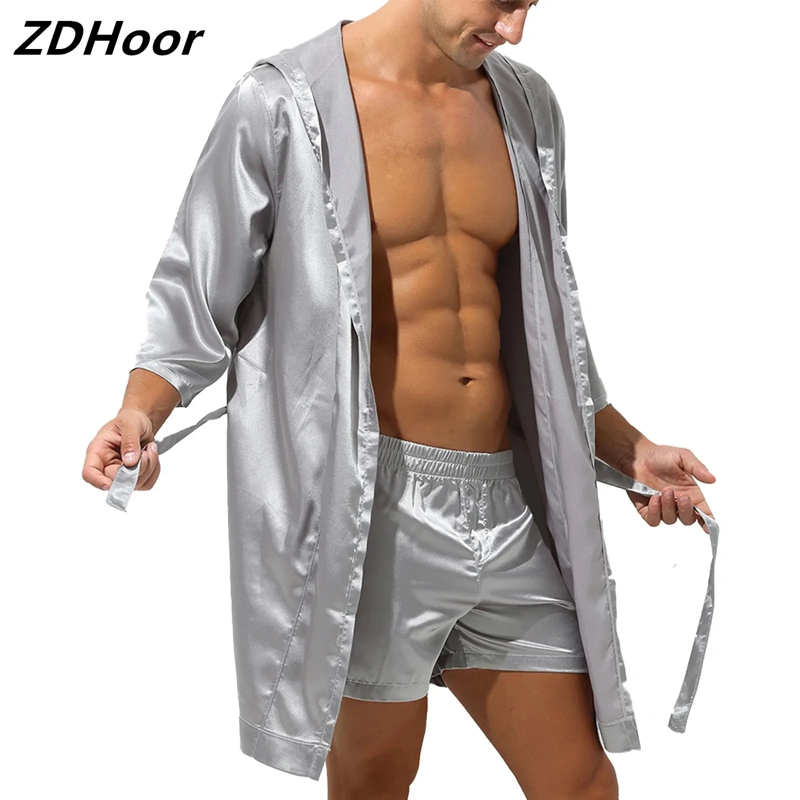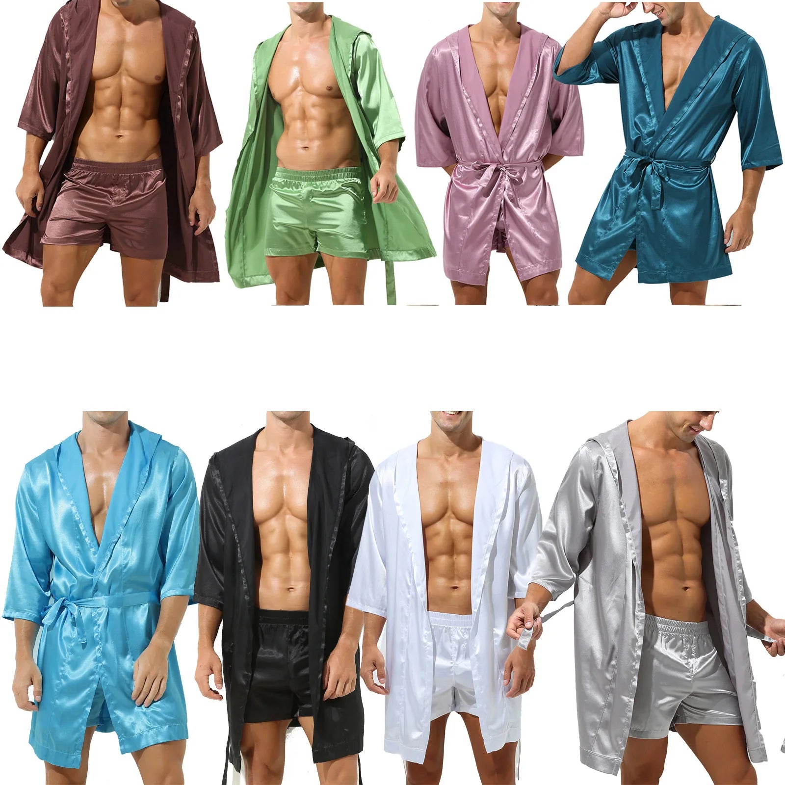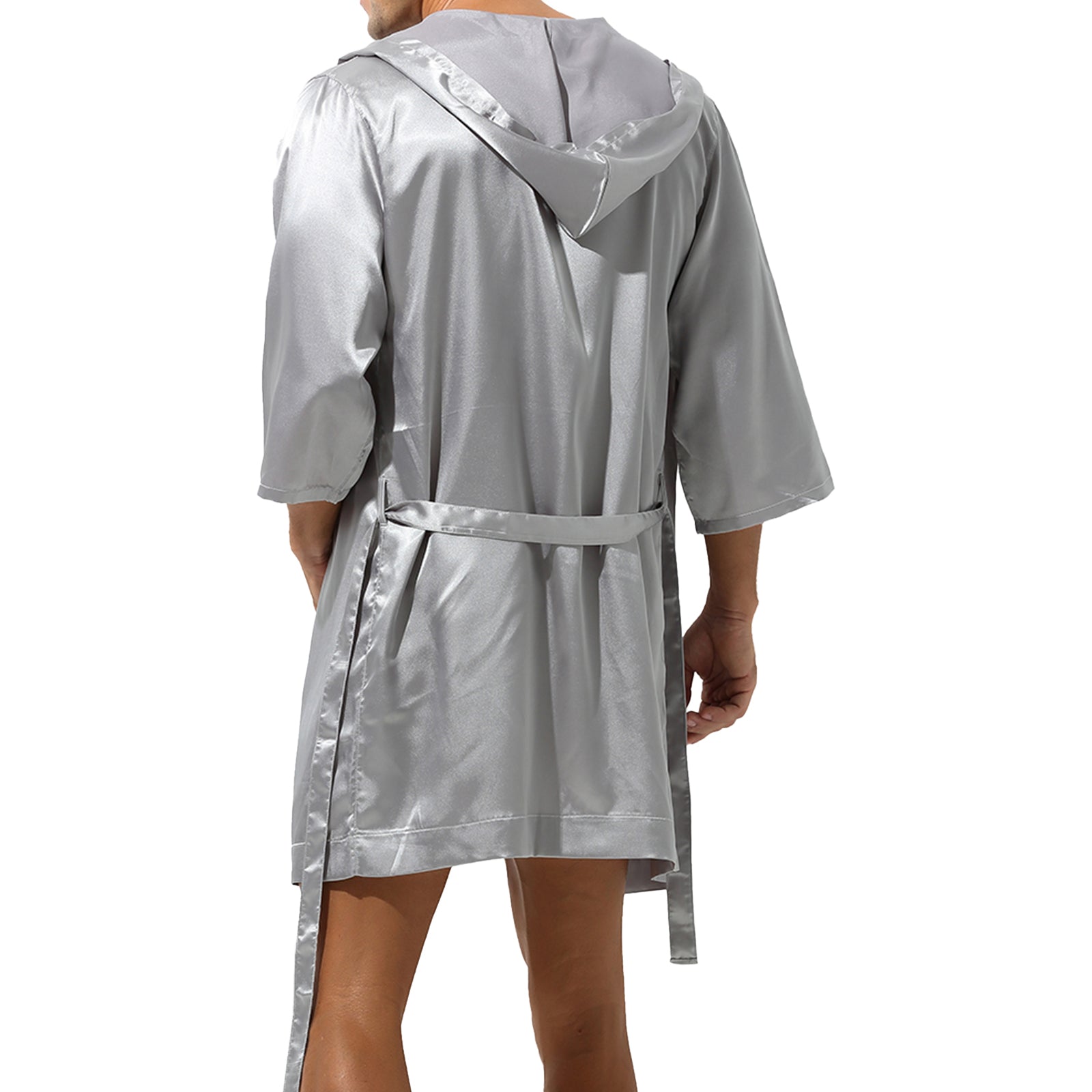 Mens Half Sleeve Sleepwear Set Hooded Open Front Belted Bathrobe with Elastic Waistband Shorts for Nightwear Loungewear