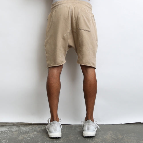 Drawstring enclosure at the waist, zip pockets, and a raw hem