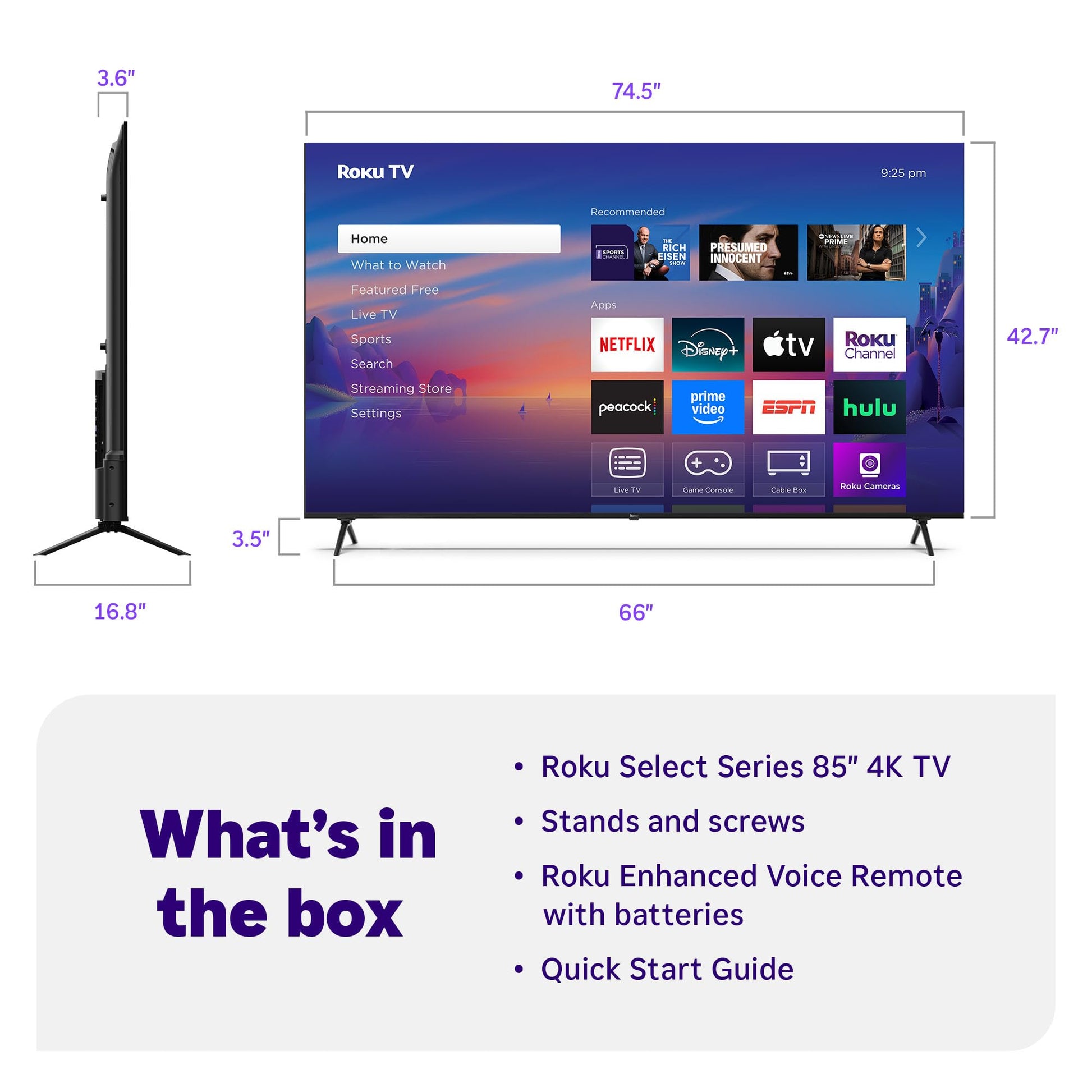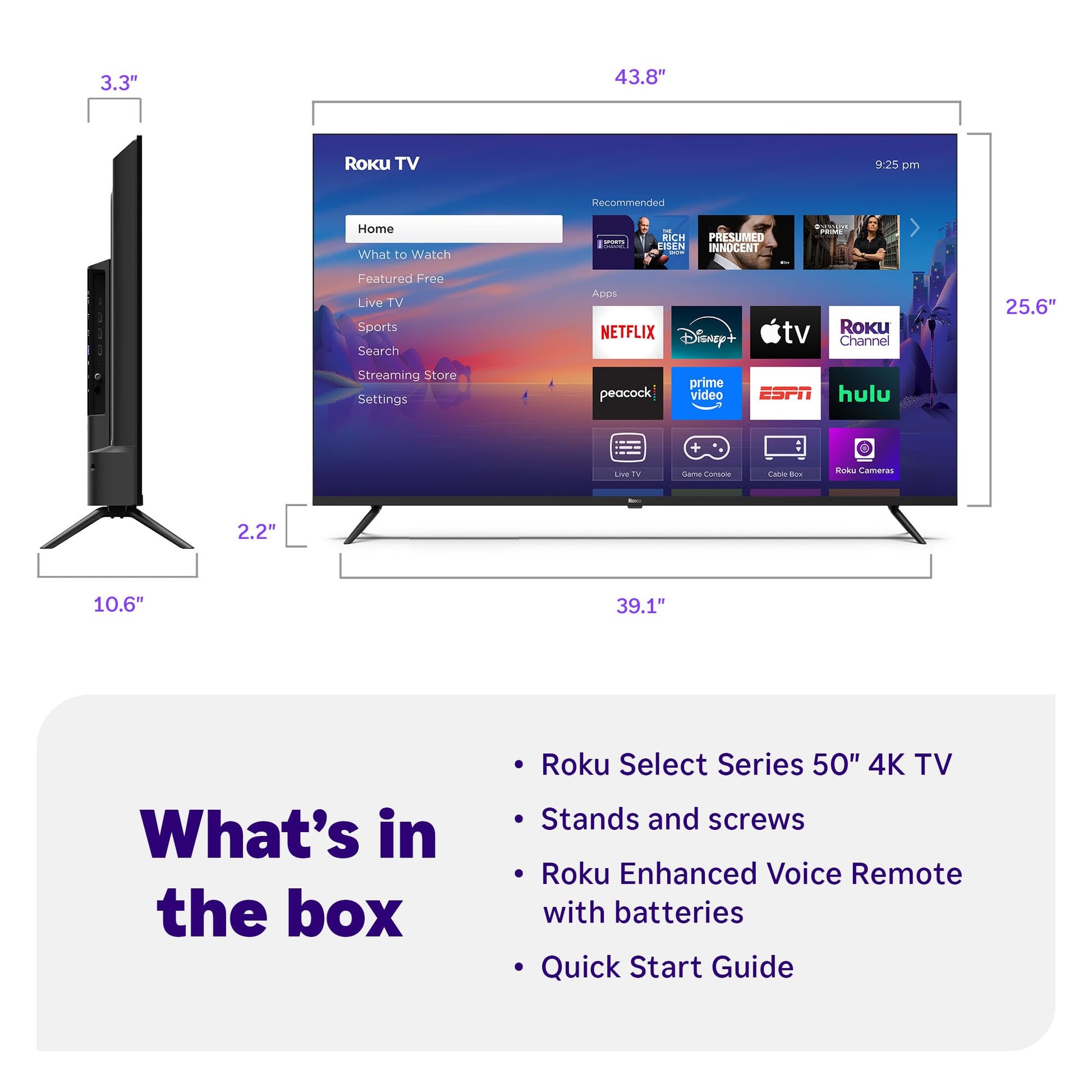 Included Components | Quick Start Guide, Roku Enhanced Voice Remote with batteries, Roku Select Series 50" 4K TV, Stands and screws See more |