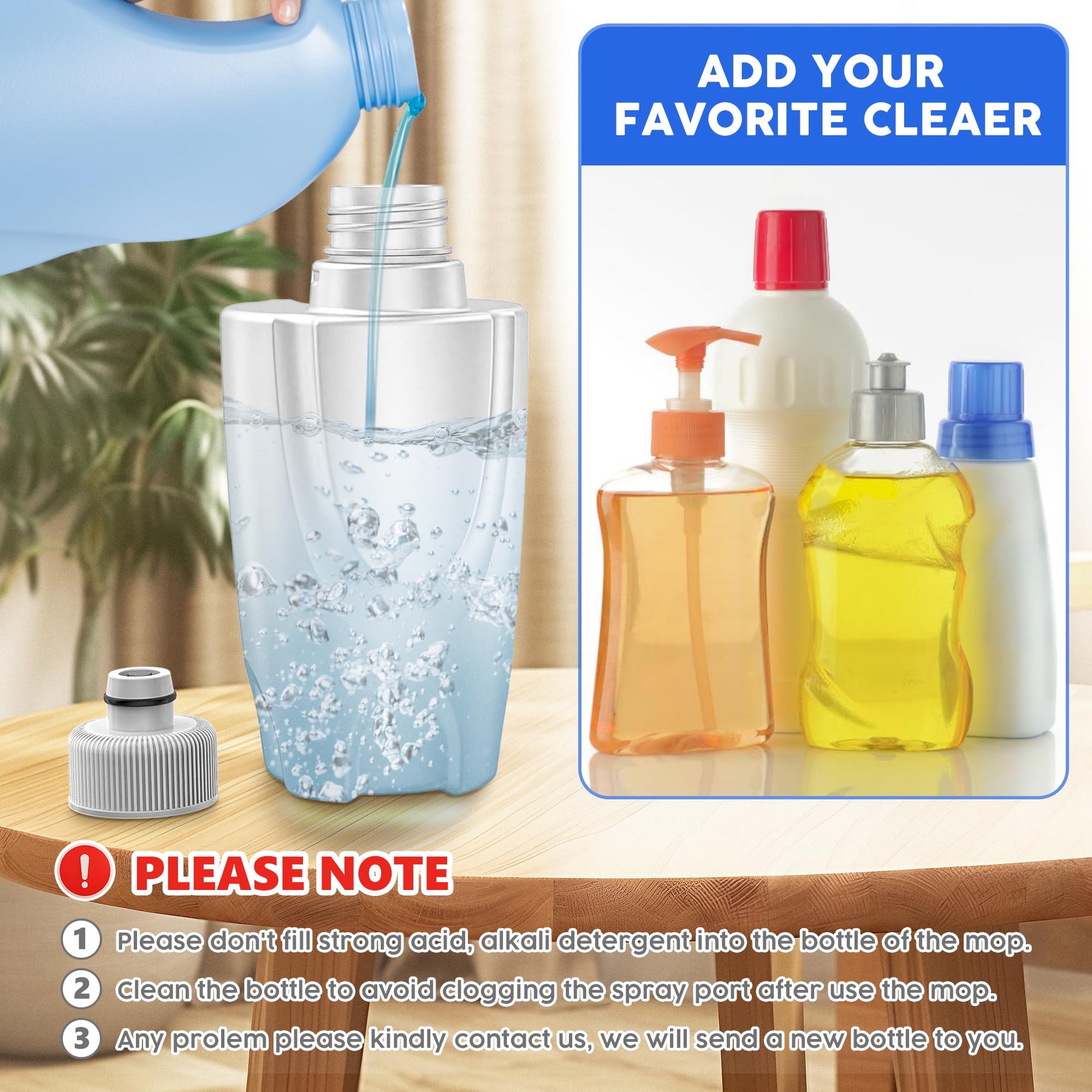 - Empty the bottle when the mop is not in use (adding strong alkali, acid, boiling water and concentrate to the bottle is not recommended)