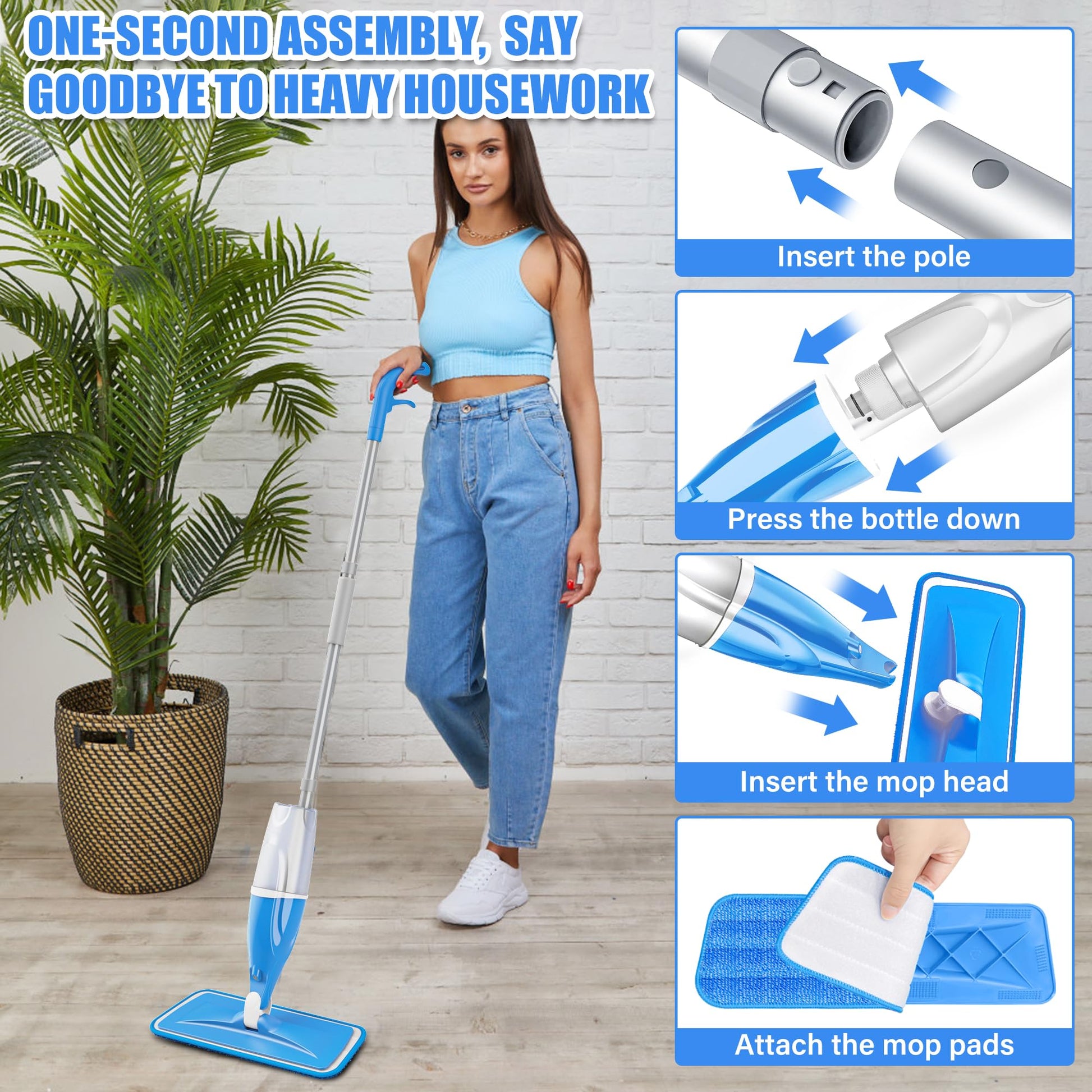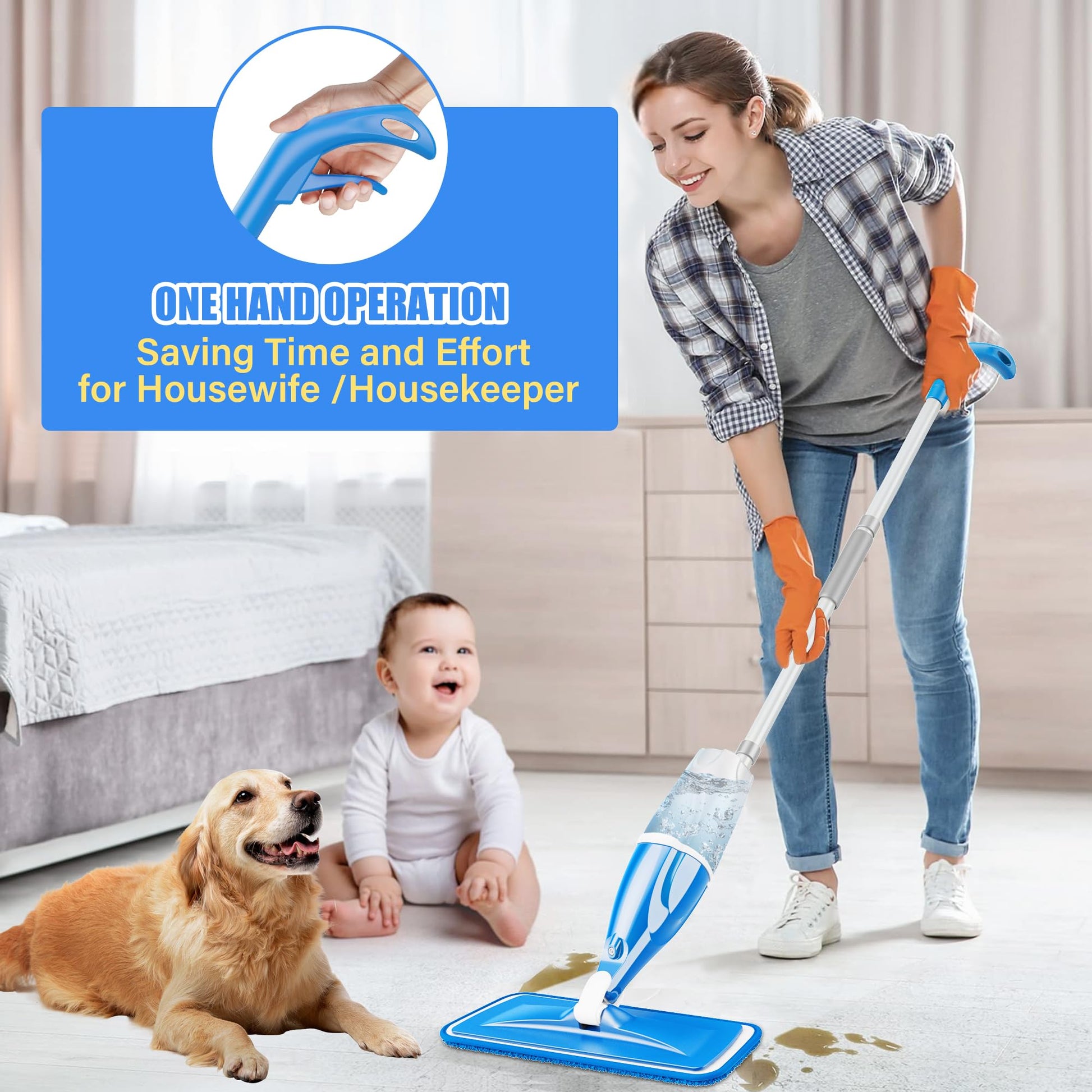 - Wet & Dry Spray Mop: Use the water spray function to wet the mop pad for deeper cleaning, or use the dry mop pad for dusting