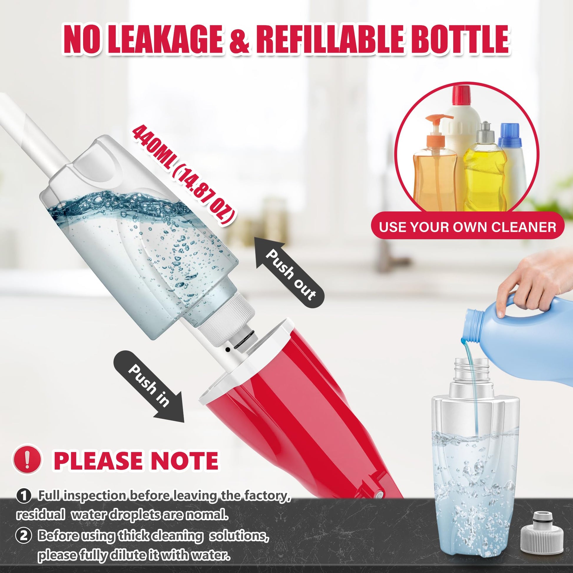 - Flat mop with refillable bottle: add your favorite detergent or water for an eco-friendly and money-saving solution